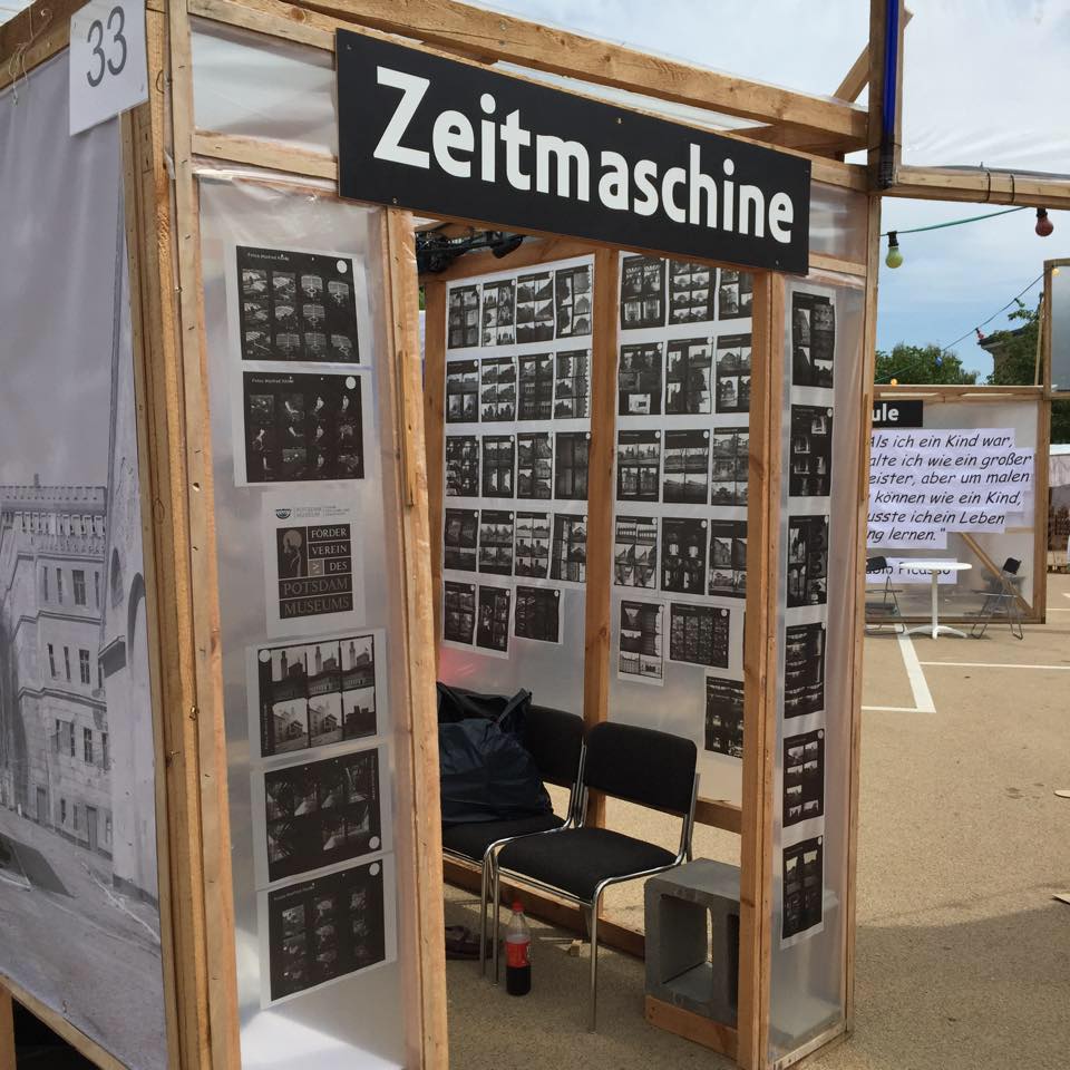 - Judith Granzow (Potsdam Museum) und der Fotograf Manfred Hamm vor der Zeitmaschine.