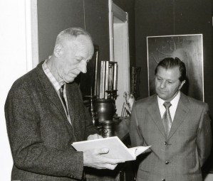 Heinrich Basedow und Dr. Heinz Müller während der Buchpräsentation „Heinrich Basedow – Meine Lebenserinnerungen“ am 29.09.1973 in der Kunsthandlung J. v. Negelein, Kiel. Potsdam Museum – Forum für Kunst und Geschichte, Potsdam. Foto: unbekannt.