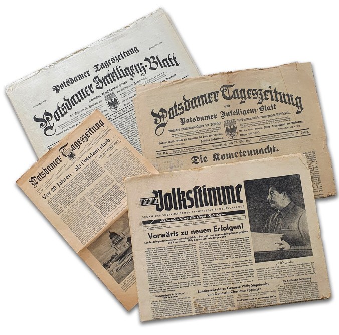 Die Sammlung umfasst Tageszeitungen aus Potsdam wie das Potsdamer Intelligenz-Blatt und die Potsdamer Tageszeitung („Potsdamer Tante“) sowie die Märkische Volksstimme. Besonders froh bin ich über einige Jahrgänge der nach dem Krieg in West-Berlin erschienenen Potsdamer Tageszeitung und natürlich die Sammlung der Märkischen Volksstimme bzw. Märkischen Allgemeinen aus den Wende-Monaten 1989/90.