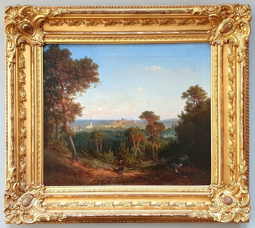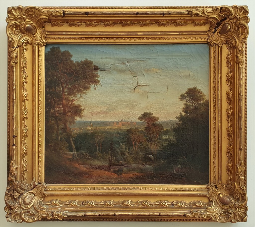 Karl Ferdinand Adolf Kießling: „Blick auf das Neue Palais in Sanssouci über Eiche vom Ehrenpfortenberg“ Datierung: 1862, Technik: Öl auf Leinwand, Bildmaße 43,7 x 51,2 cm, Rahmenmaße 64,0 x 71,0 x 10,0 cm, Gesamt mit Schmuckrahmen – Nach der Restaurierung | © Potsdam Museum, Foto Oliver Max Wenske