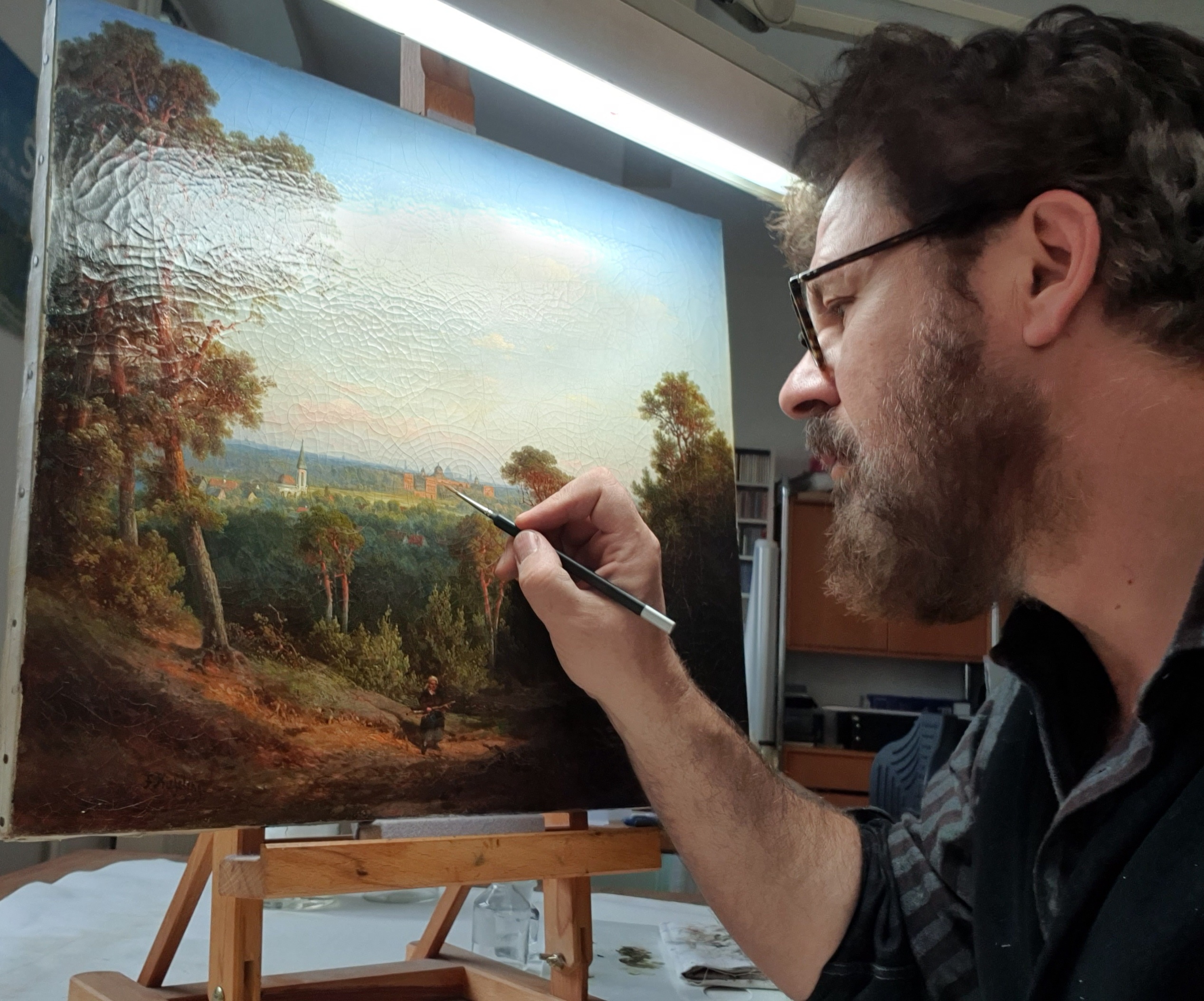 Oliver Max Wenske während der Retusche am Gemälde © Potsdam Museum, Foto Grit Jehmlich